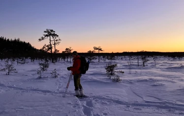 Valkmusan kansallispuiston tasainen, sulanmaan aikana tavoittamattomissa oleva suomaasto houkuttelee seikkailemaan auringonnoususta aina iltahämärään ja vaikkapa ihan kuunloisteeseen saakka.